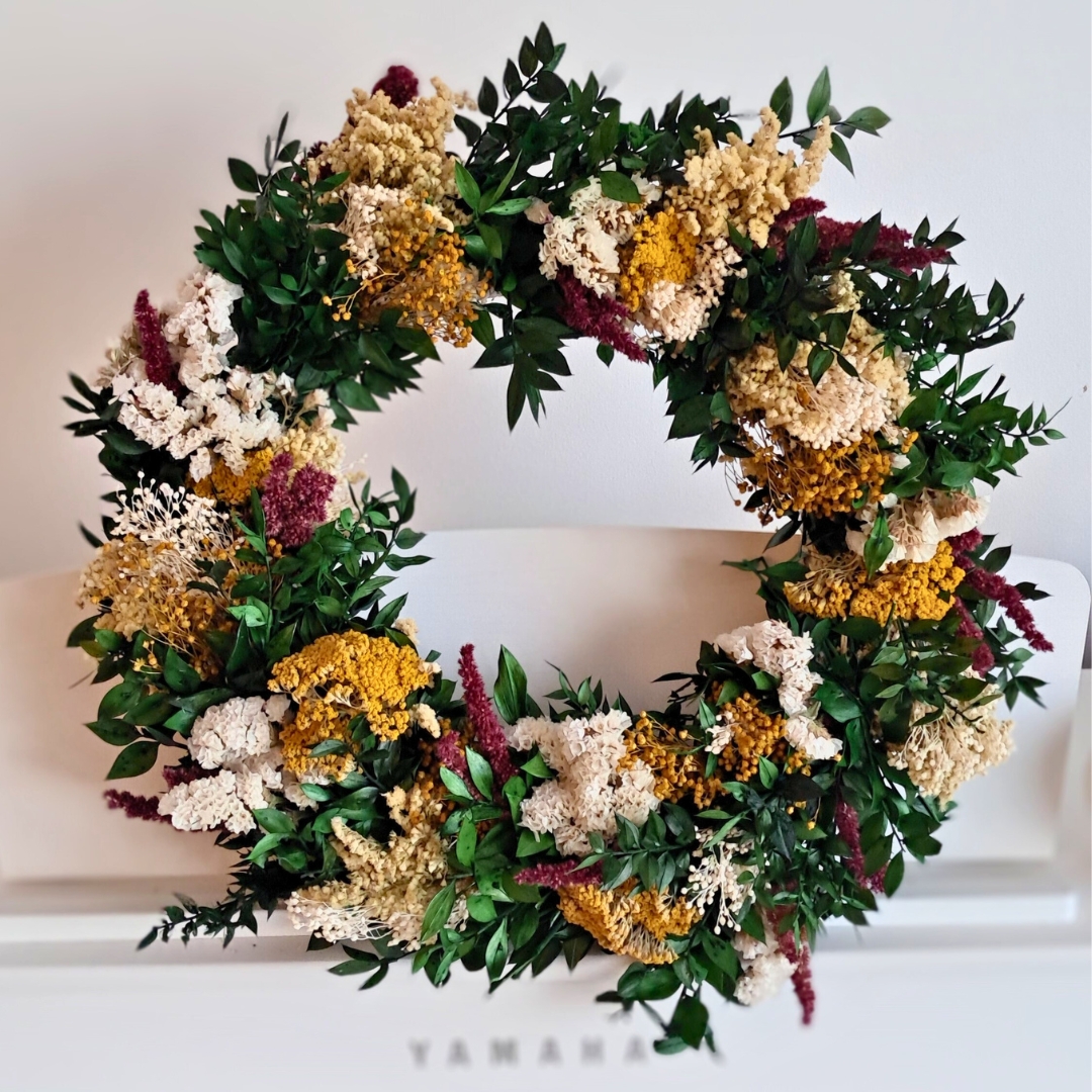 Handmade with fresh greenery, dried oranges, red berries, pine cones and a rustic burlap bow. Every wreath smells like Christmas moved in and made itself comfortable. Built on a biodegradable base and made to last for weeks with a bit of love and the occasional misting. Made slowly, sustainably, and with enough festive charm to make the neighbours peek over the fence.