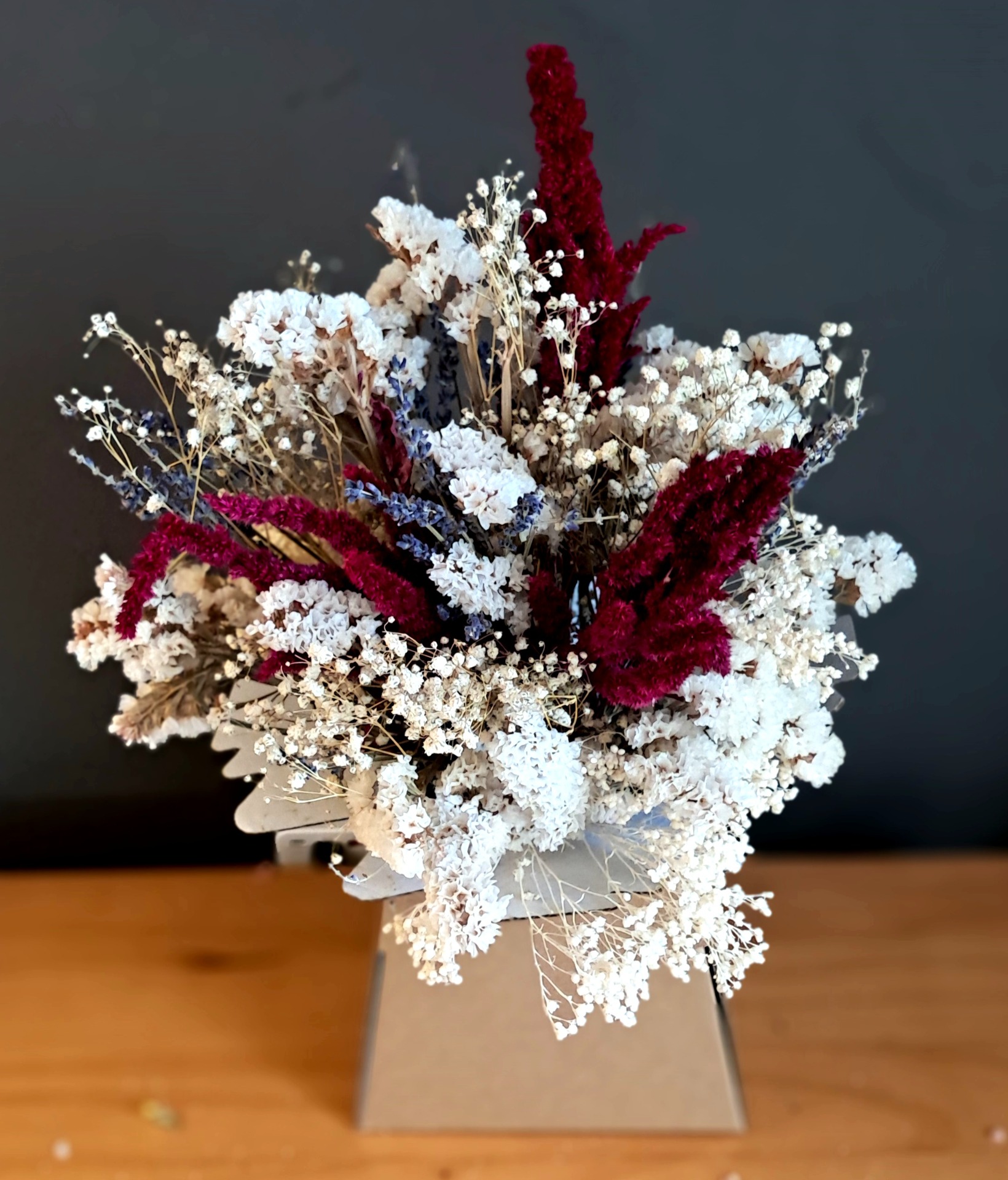 White dried flower arrangement with a spalsh of vibrant pink.